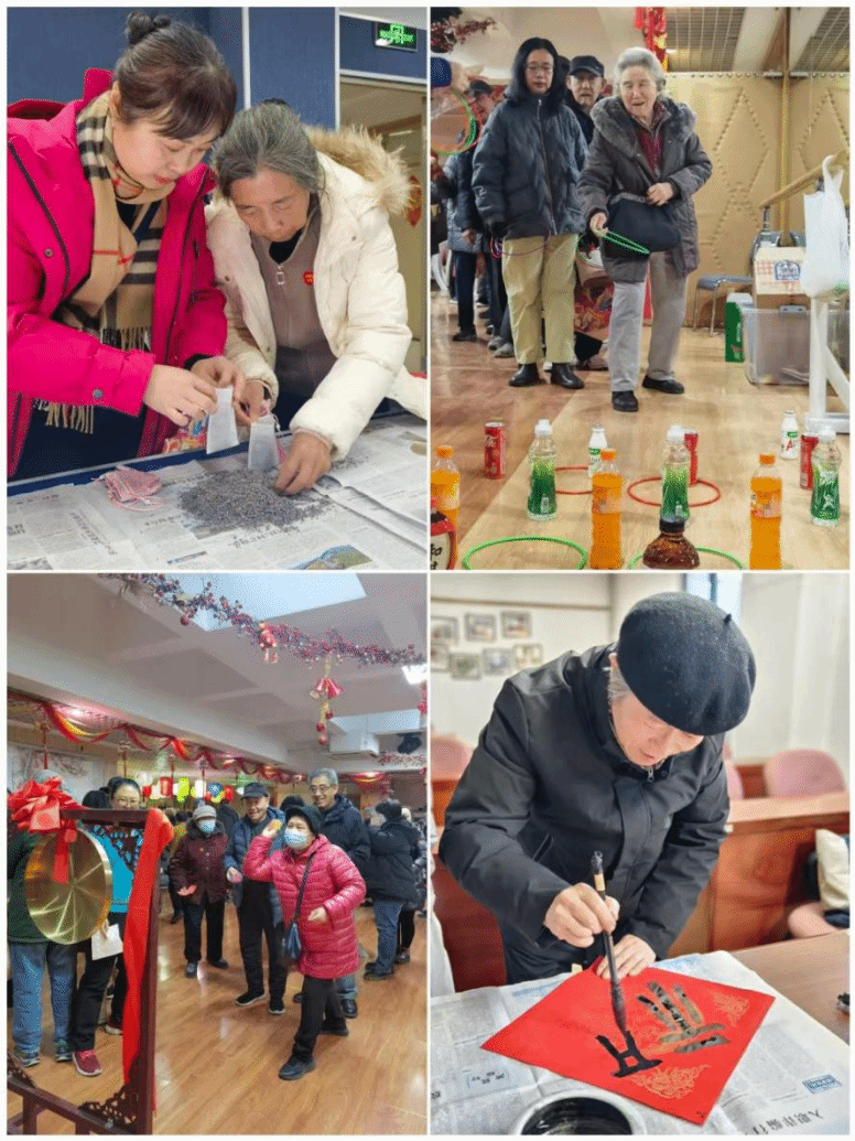 团拜会结束后,游艺活动热闹启幕。套圈、沙包打锣、飞镖打气球三个项目前,老同志们精神矍铄各展身手,瞄准目标凝神投掷,每一次精彩表现都引来阵阵喝彩,欢声笑语不断;猜谜语区彩灯高悬,谜面趣味十足,大家或独自思索或低声探讨,沉浸在益智互动的乐趣中。制作香囊专区香气氤氲,写福字区笔墨飘香,满载新春福气。现场人头攒动、暖意融融,尽显马年团圆喜乐氛围。