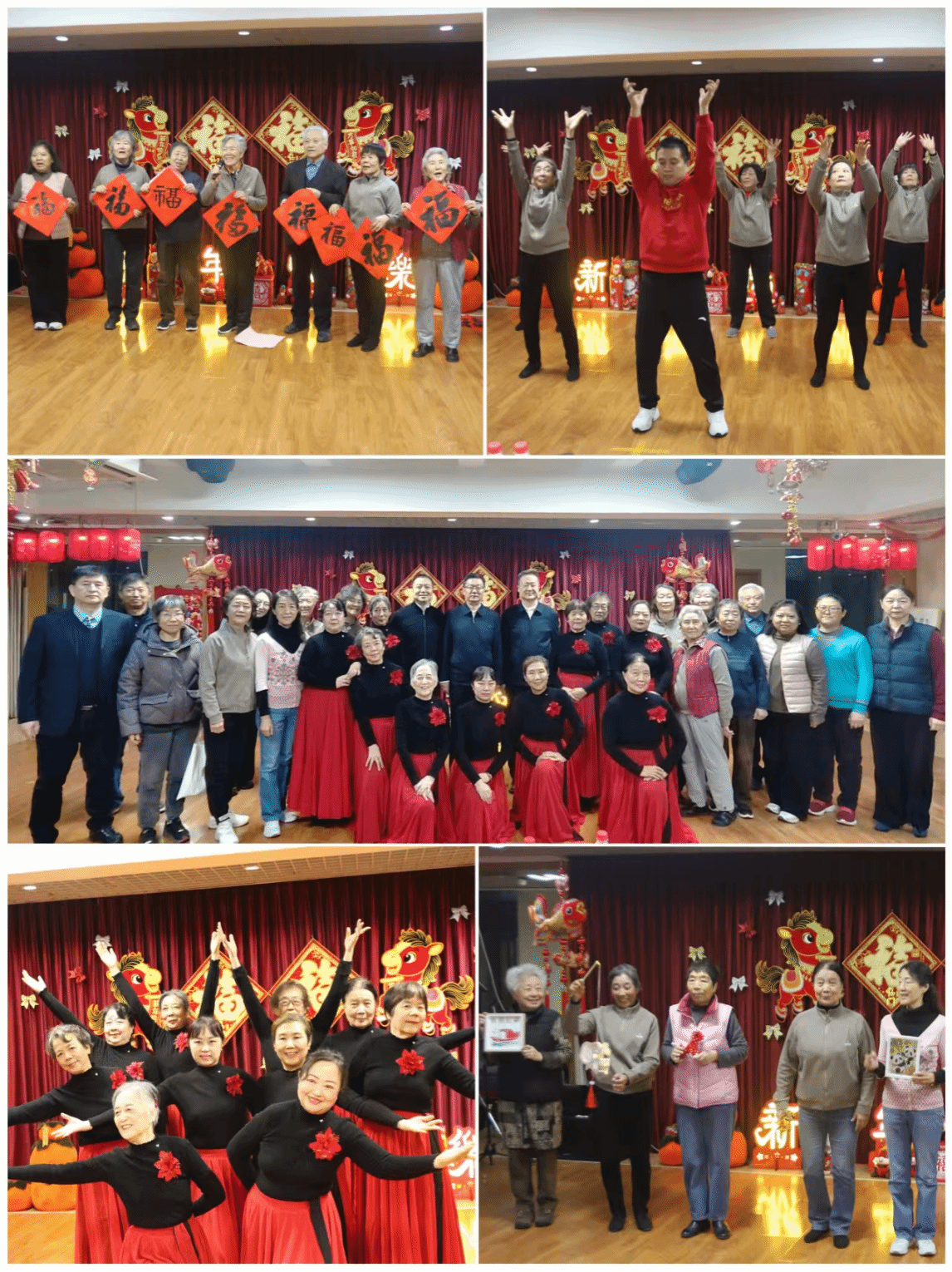 老年大学课程汇演环节成为团拜会的一大亮点。由老同志自编自导自演的节目轮番登场,彰显“龙马精神”:“八段锦”学员的五禽戏展示,动作舒展连贯、刚柔并济,一招一式尽显养生智慧与从容气度;书法班学员现场挥毫泼墨,不同字体的“福”字寓意吉祥,饱含新春祝福,随后学员们将作品一一赠予现场人员,传递着浓浓的年味儿与情谊;手工班的非遗作品展示令人眼前一亮,竹编画、花草纸兔灯、吉祥中国结等一系列精美作品,凝聚着老同志们的巧思与匠心,彰显了传统文化的独特魅力;舞蹈班带来压轴舞蹈《灯火里的中国》,老同志们身着盛装,舞步整齐优美,眼神中满是对祖国的热爱与对美好生活的赞颂,深情的演绎将现场气氛推向高潮,赢得了全场经久不息的掌声。